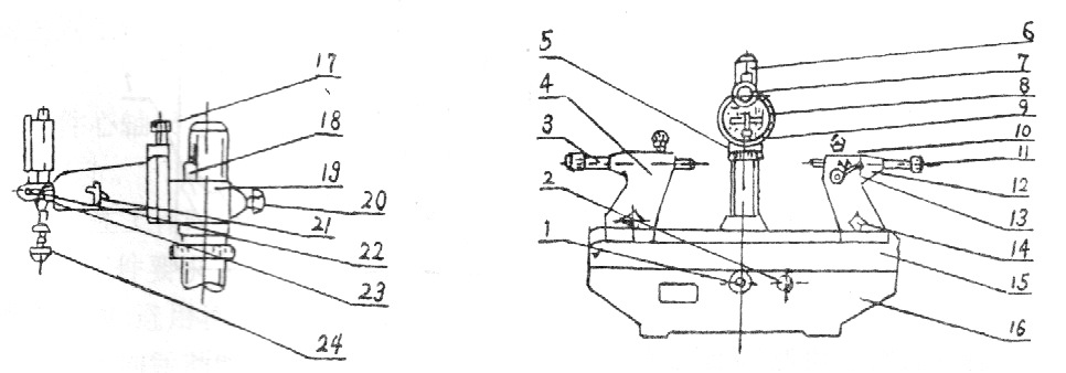 1.膠木手柄 2.膠木螺帽 3.頂針 4.左頂針架 5.升降螺帽 6.立柱 7.千分表 8.測量支架 9.測量頭 10.膠木螺釘 11.M4膠木螺釘 12.右頂針架 13.手柄 14.膠木螺帽 15.臺面 16.底座 17.緊固螺釘 18.指標塊 19.測量座 20.膠木螺釘 21.手柄 22.螺釘 23.表架 24.接頭